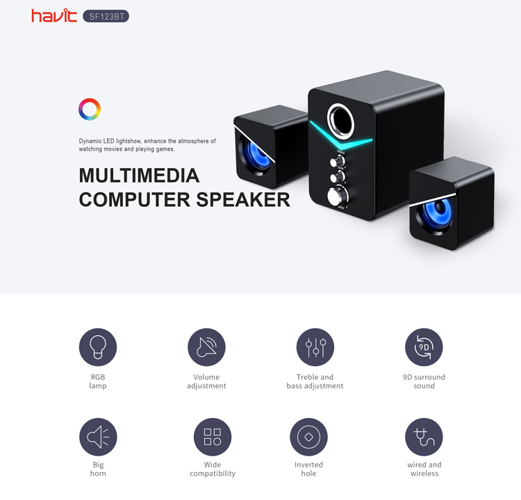 Havit HV-SF123BT Динаміки Havit HV-SF123BT з 2,0-канальною конфігурацією, частотною характеристикою від 25Гц до 20кГц та вихідною потужністю 3Вт+2Вт*2 призначені виключно для отримання чітких та гучних звуків. Акустична система Havit HV-SF123BT забезпечує чітку якість звуку з меншим рівнем шуму.